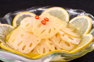 2:將糖、醋、鹽倒入蓮藕中拌入味,擺盤時(shí)可將一些辣椒圈撒在上面裝飾即可。