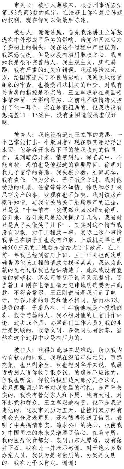 人民網(wǎng)北京8月26日電 今日,薄熙來受賄、貪污、濫用職權(quán)案庭審進(jìn)入第五天,開始進(jìn)行法庭辯論。在控辯雙方進(jìn)行辯論之后,被告人薄熙來進(jìn)行最后陳述。