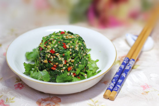 5.焯熟的芹菜葉晾涼擠去水分切末,