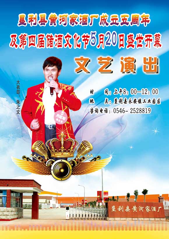 2012墾利縣黃河家酒廠成立五周年暨第四屆儲酒文化節(jié)5月20日盛世開幕,特別邀請了“大衣哥”---朱之文前來助陣,屆時東營的朋友們將會現(xiàn)場欣賞朱之文及眾明星的精彩演出。地點(diǎn):墾利縣黃河家酒廠院內(nèi)。咨詢電話:0546-2528819
