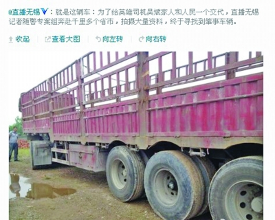 昨日,無(wú)錫警方通報(bào)了該案的最新調(diào)查進(jìn)展后,即有消息在微博上傳出,大意是無(wú)錫警方將把“闖禍”大貨車(chē)和司機(jī)帶回?zé)o錫進(jìn)行進(jìn)一步調(diào)查,一些實(shí)名認(rèn)證的個(gè)人和官方微博也隨即轉(zhuǎn)發(fā),引起廣泛關(guān)注和議論。對(duì)此,無(wú)錫警方明確表示,這類(lèi)消息子虛烏有,都未向無(wú)錫警方確認(rèn)過(guò)。目前,“5·29”事故被定性為一起交通意外,“闖禍”大貨車(chē)和司機(jī)不是該案的犯罪嫌疑人,按照法律規(guī)定,警方肯定不會(huì)將司機(jī)和大貨車(chē)帶回?zé)o錫進(jìn)行調(diào)查的。
