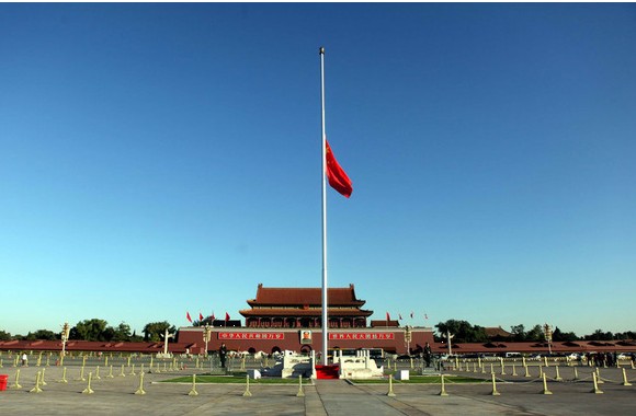 2012年10月17日,北京,為哀悼柬埔寨前國王諾羅敦-西哈努克逝世,新華門、天安門廣場降半旗志哀。