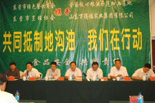 2011年9月15日上午,由東營市綠色餐飲商會、東營市烹飪協(xié)會攜手全國放心糧油示范加工基地山東萬得福實業(yè)集團有限公司發(fā)起的“共同抵制地溝油、我們在行動”新聞發(fā)布會及誓師大會在著名的東營白云飯店隆重召開,出席這次大會的主要領(lǐng)導(dǎo)有:東營綠色餐飲商會會長唐金虎先生,秘書長、齊魯園總經(jīng)理張若同先生,副會長、心連心連鎖餐飲集團創(chuàng)始人殷勇先生,副會長、白云飯店總經(jīng)理高峰先生,副會長、百盛園酒店董事長王中華先生,副會長、鴻豐餐飲總經(jīng)理常登舉先生,山東天河酒店集團副總經(jīng)理燕軍先生,山東萬得福集團領(lǐng)導(dǎo)韓占武先生、高軍星先生,綠色餐飲商會常年法律顧問、山東奮飛律師事務(wù)所主任高伯良先生。同時,東營電視臺、齊魯晚報、東營001餐飲網(wǎng)、東營區(qū)電視臺等傳媒界朋友,現(xiàn)場進行了采訪報道。